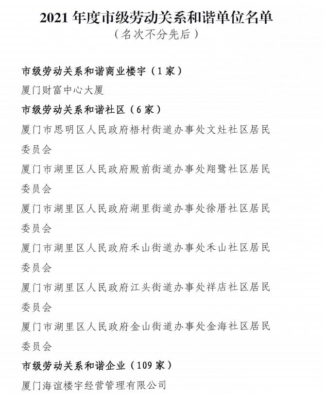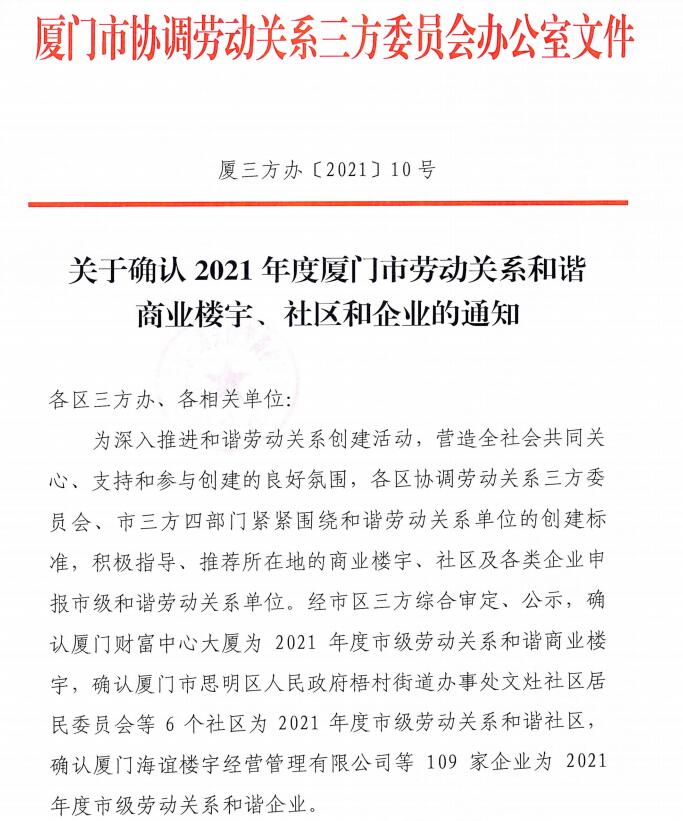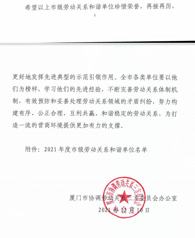 5657威尼斯(中国)有限公司公司荣获2021年度厦门市劳动关系协调企业