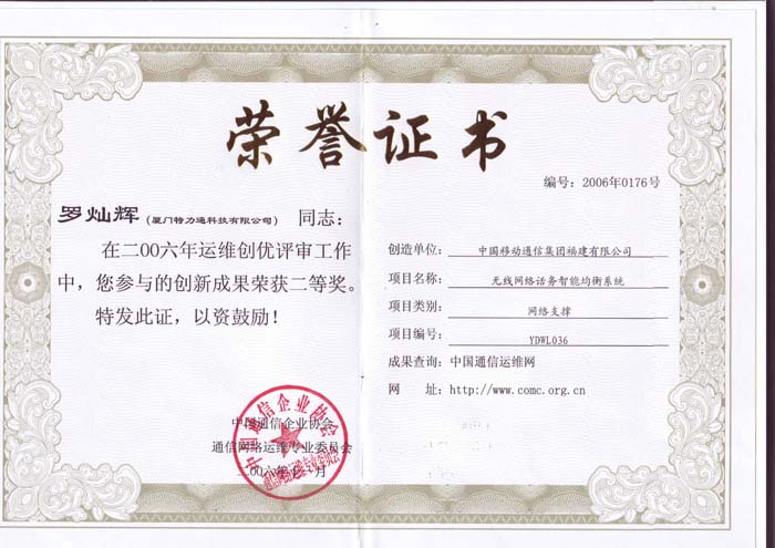 2006年11月 2006年度运维创优评审事情中“无线网络话务智能平衡系统”获立异效果二等奖
