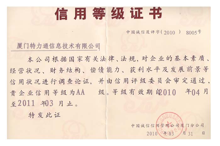 2011年03月 2010-2011年信用品级证书